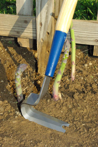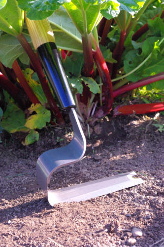 Heron Weeder, with wood handle, amongst the Rhubarb.