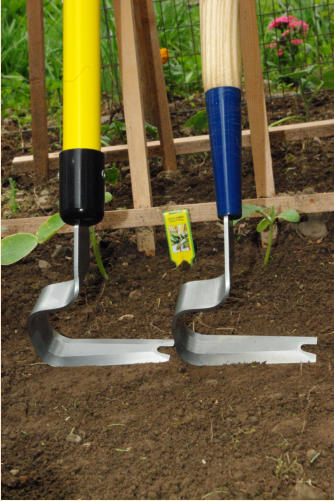 Heron: Our main tool. Rigid and durable 6 in. blade for any condition, especially rock and clay. Available with a 54” shorter handle. (60” is standard.) Fiberglass handle tool weighs 2.46 pounds.    Wood handle tool weighs aprox. 2.88 pounds. See a field tested review @ http://www.joshvolk.com/Reviews/heronhoe.html   TheBayouGardener- Forum review of the Hooke 'n Crooke.
